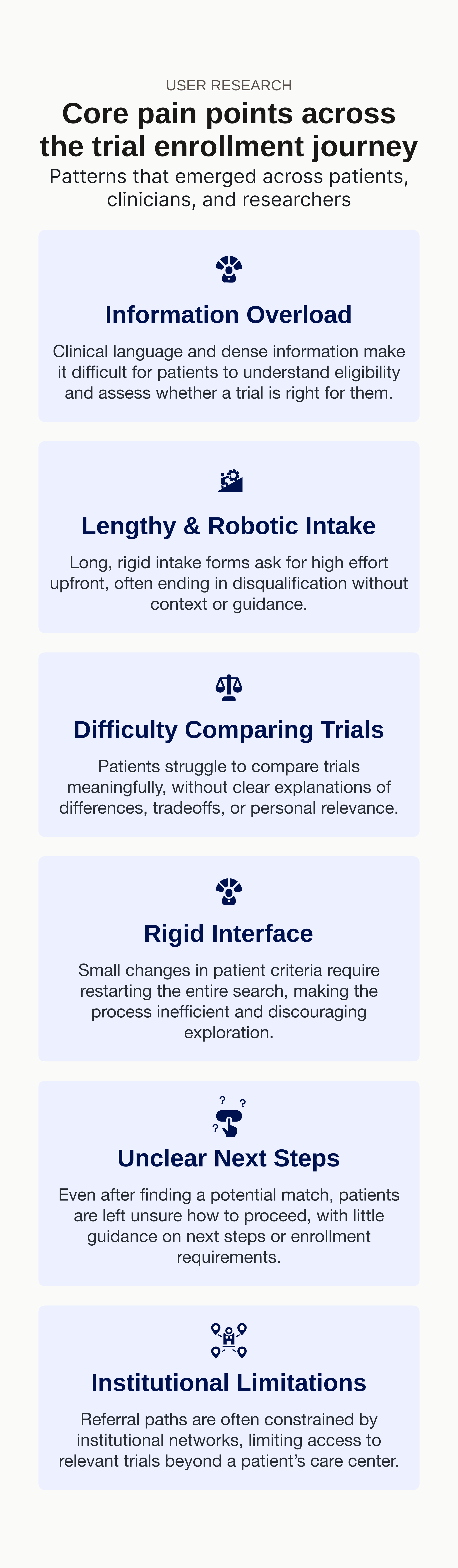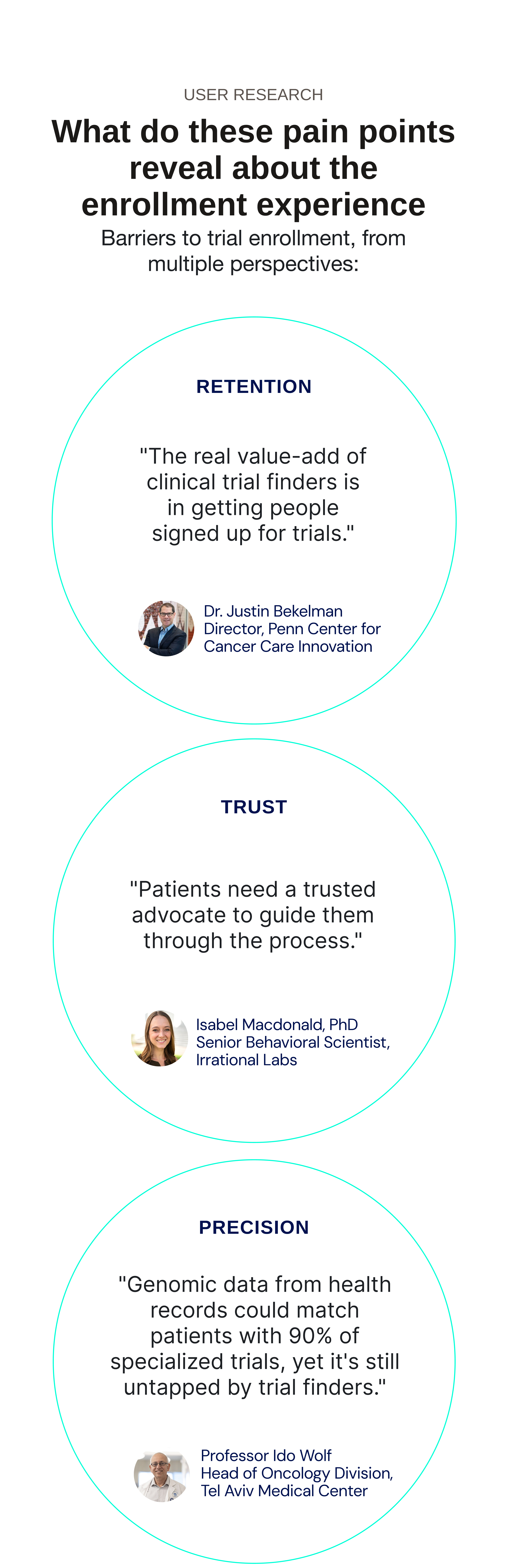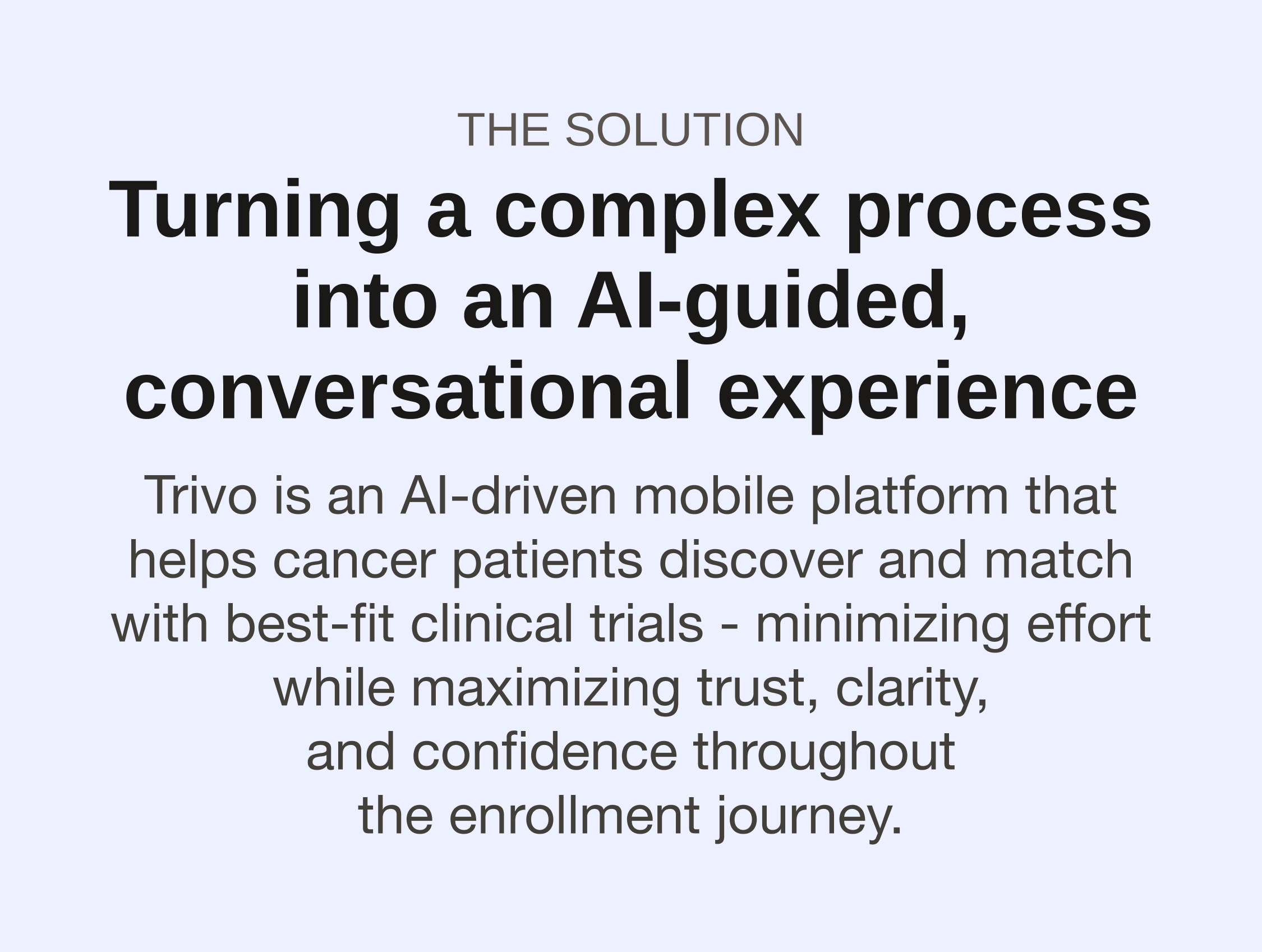 A platform that addresses the lack of trust, accuracy, and retention in the current clinical trial searching process through a patient-centered conversational UI.