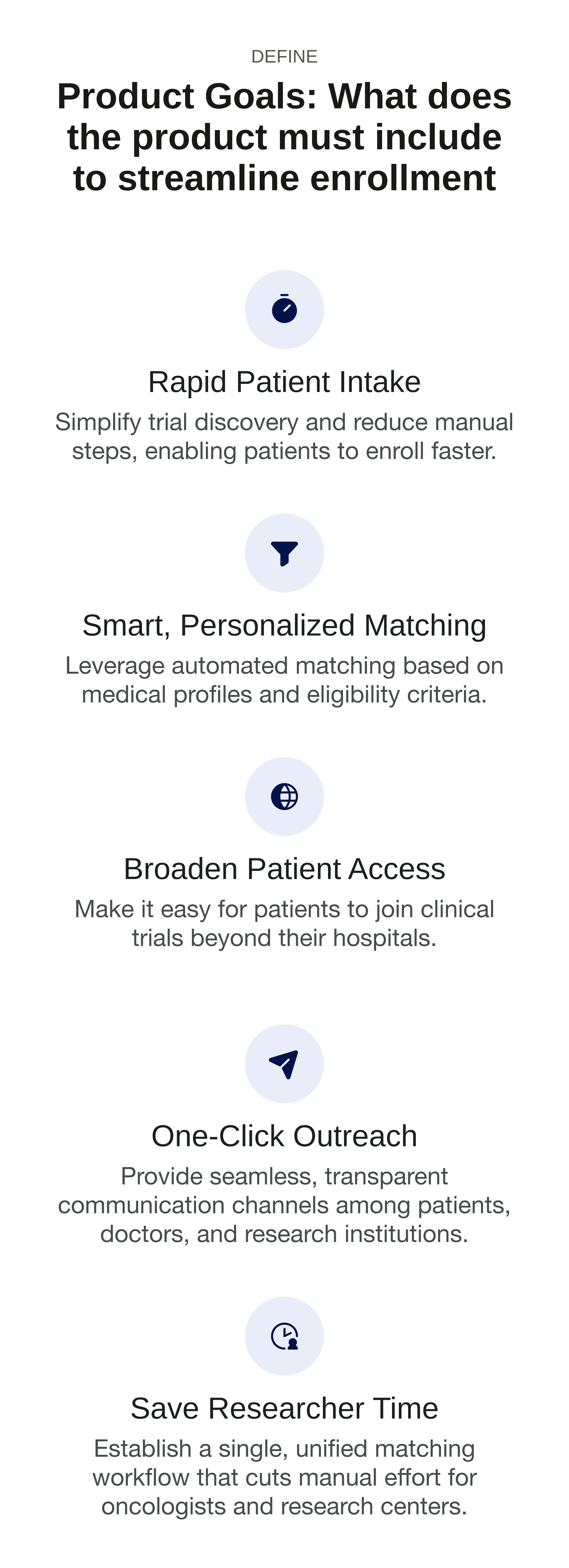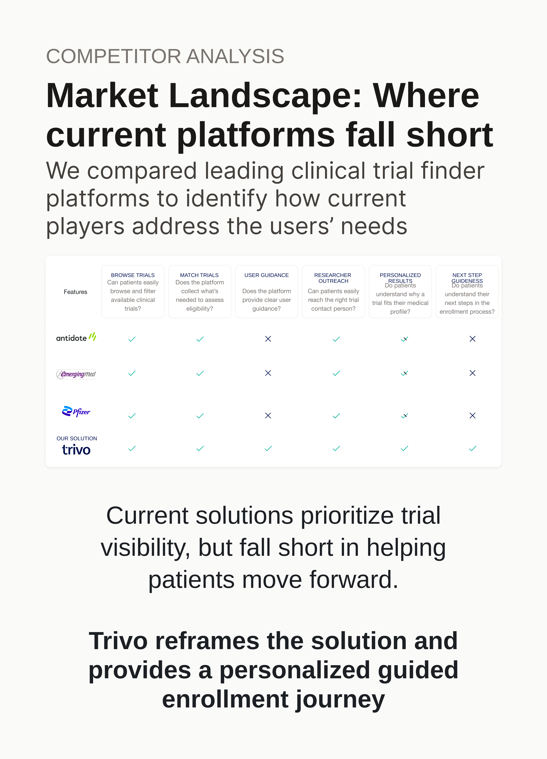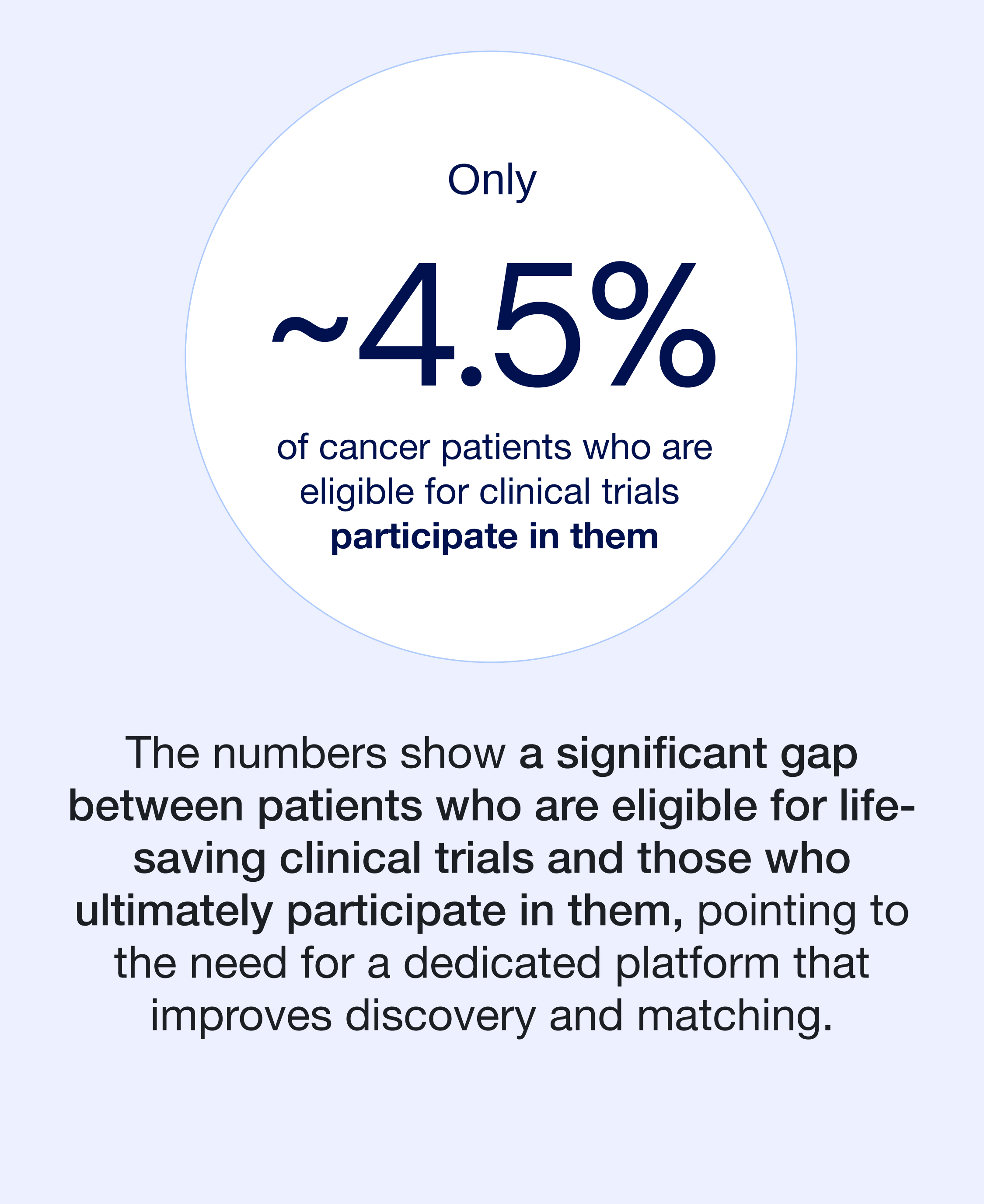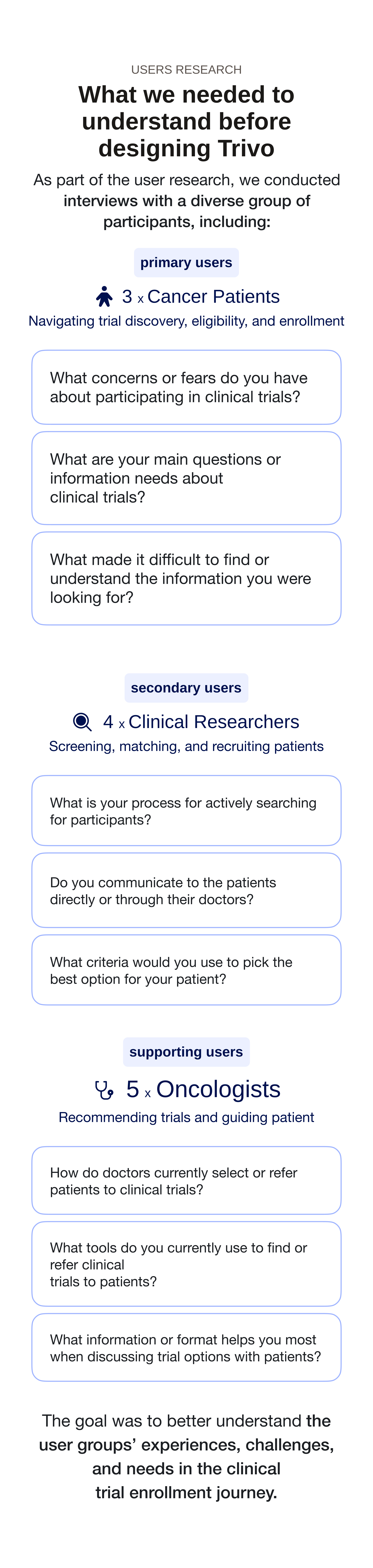 A platform that addresses the lack of trust, accuracy, and retention in the current clinical trial searching process through a patient-centered conversational UI.